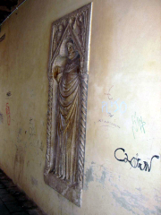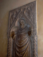 Per arrivare a vedere questa curiosità bisogna scendere dal ponte dei Scalzi, dalla parte opposta della stazione ferroviaria, inoltrandosi dentro la calle lunga Bergama, oltrepassare il ponte de la Bergama e arrivare in campo Santo, dove sullo sfondo s'innalza l'antica chiesa di San Simeon Grando. Muovendo verso l'edificio sacro, sul fianco sinistro si apre il sotoportego de la Chiesa, dove verso la fine si trova murata una grande, e per qualche verso enigmatica, lastra in marmo bianco di Verona. La prima versione vuole che sulla pietra si troverebbe scolpito San Ermolao, a testimonianza del fatto che una schola de devozion a lui intitolata aveva nelle vicinanze la propria sede. La seconda versione indica la grande lastra come un sigillo sepolcrale, raffigurante un non meglio identificato vescovo ritratto nell'atto di pregare, in ciò identificato dalle mani alzate che mostrano le palme. A questo proposito va ricordato che il pavimento della chiesa di San Simeon Grando venne completamente ricoperto da uno successivo, quando il Governo venne a conoscenza che un appestato era stato colà abusivamente tumulato. Si volle forse conservare alla vista del popolo una immagine oggetto di devozione ? Sulla questione il Tassini non fa alcun accenno; il Lorenzetti invece (Venezia e il suo estuario, TRIESTE, 1975, pag. 476) riprende la versione del sigillo: "(…) CALLE SOTTOPORTICO DELLA CHIESA: sul muro, a d.: Pietra tombale con rilievo di Vescovo orante (princ. XV sec.).(…)."