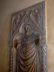 Di ritorno da un viaggio, Andrea Baldovino ed Angelo Drusiano portarono a Venezia, nel 1205, alcune ossa di Sant'Ermolao, che vennero ospitate nella chiesa di San Simeon Grando. Non molto tempo dopo, come spesso accadeva, venne istituita una Confraternita in onore di questo Santo, che si raccoglieva presso un locale nelle vicinanze del sotoportego de la Chiesa. Dentro il sotoportego è difatti murata una lapide, più propriamente un sigillo sepolcrale, raffigurante, pare, Sant'Ermolao a figura intera, opera che si stima essere stata eseguita nel XIV secolo. In merito alla posizione nella quale è ritratto il Santo, specificamente le mani tenute in atteggiamento orante, i veneziani hanno ricavato una curiosità.