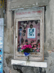 fondo, abbellita da panno in fiorami rosa pendono sono appesi alcuni ex voto