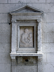 timpano, colonne ioniche, mensola sporgente sorretta da due